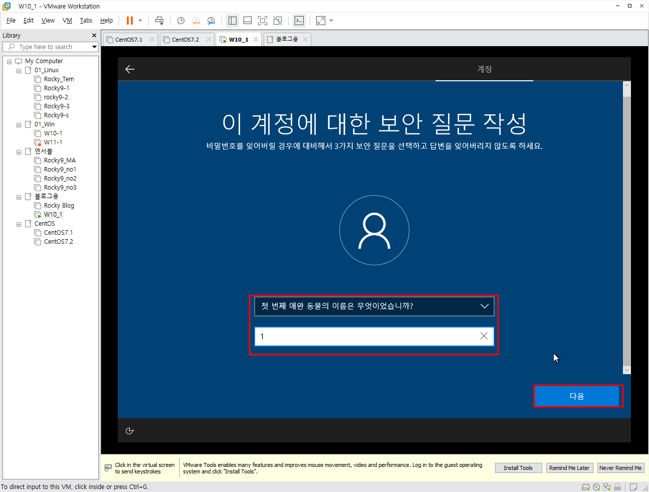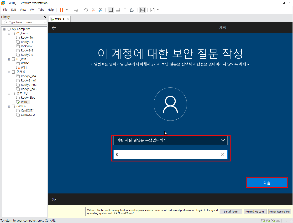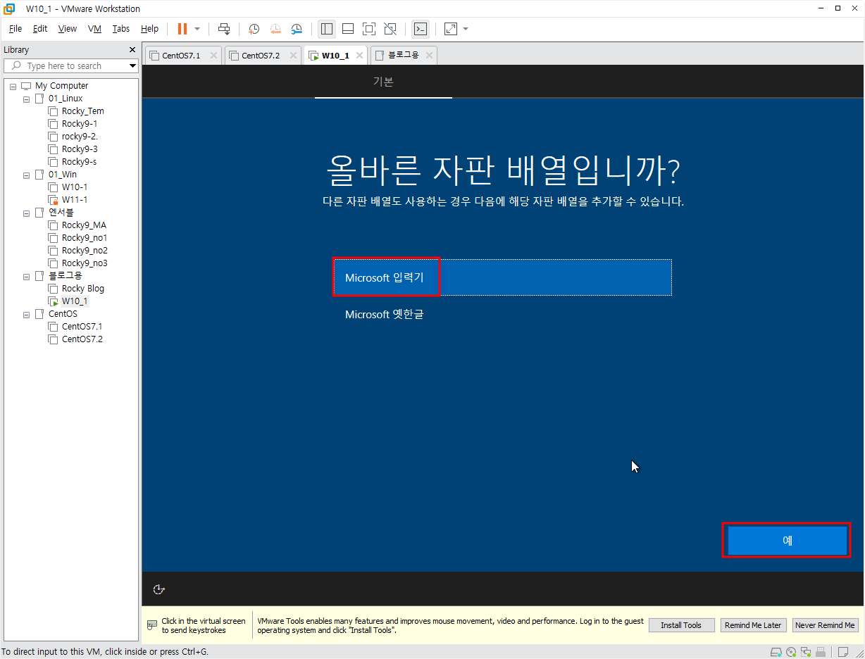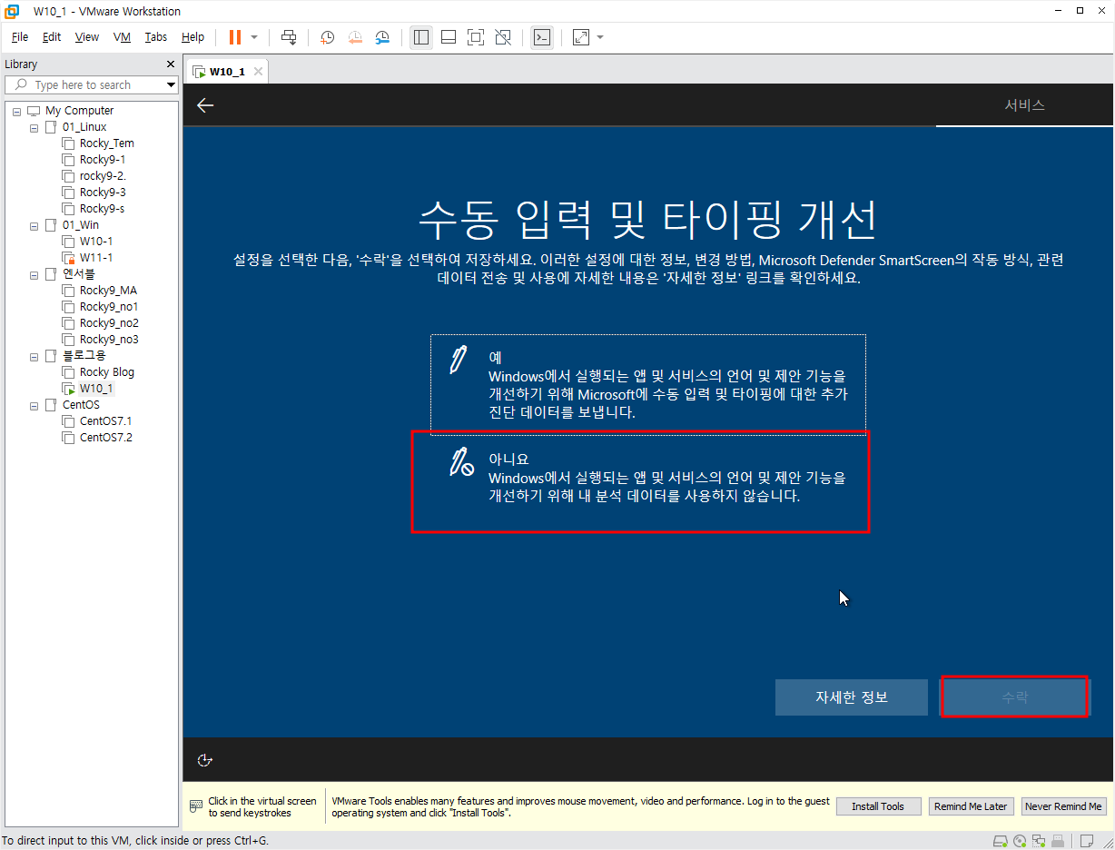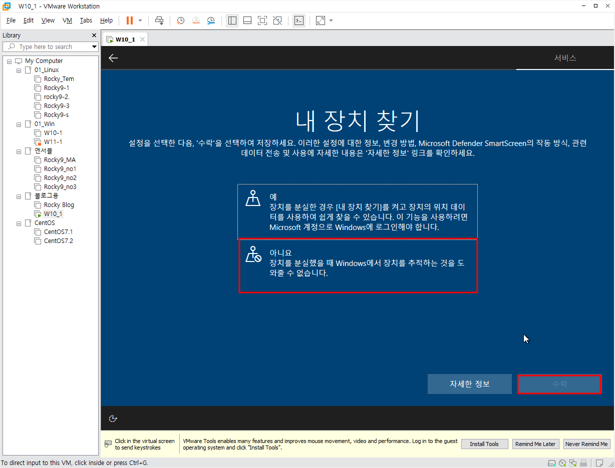 먼저 학습을 위해 설치하는 것임으로 위치나 기타 설정들은 전부 아니요를 선택했다. 인터넷 연결방법은 linux와 연계해서 나중에 해 볼 것이다.