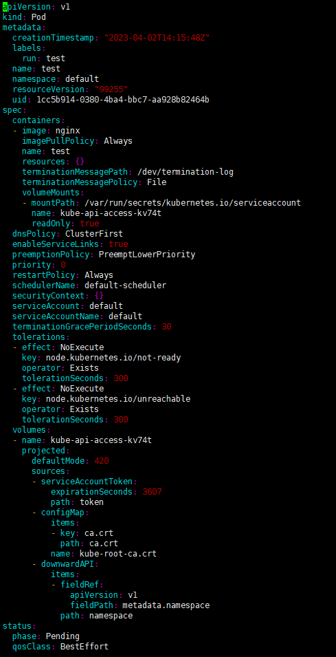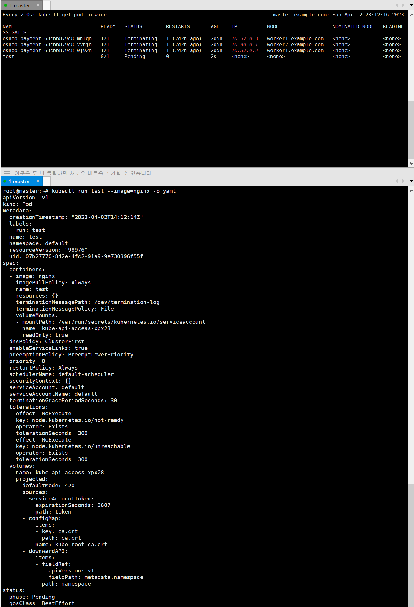 먼저 yaml 형식으로 보는 옵션은 -o yaml 입니다. 이를 명령어에 끼워주면 해당 내용을 볼 수 있습니다.