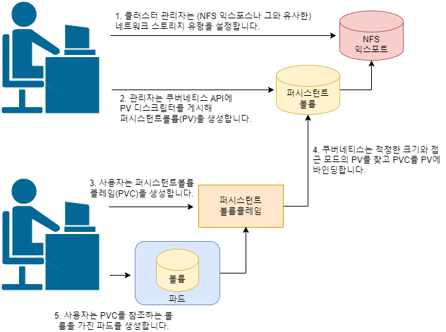 개발자가 파드에 기술적인 세부 사항을 기재한 볼륨을 추가하는 대신 클러스터 관리 자가 기반 스토리지를 설정하고 쿠버네티스 API 서버로 퍼시스턴트볼륨 리소스를 생성해 쿠버네티스에 등록합니다. 퍼시스턴트볼륨이 생성되면 관리자는 크기와 지원 가능한 접근 모드를 지정합니다.