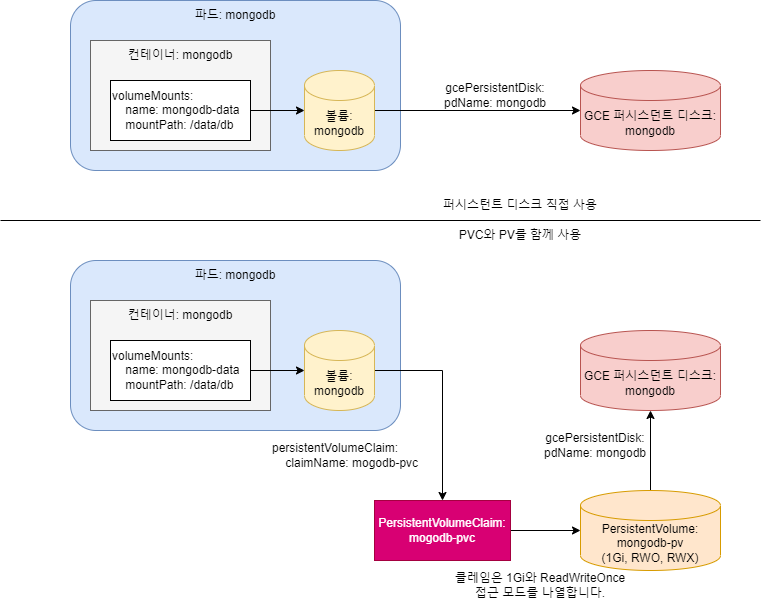 다음 그림은 파드가 GCE 퍼시스턴트 디스크를 직접 사용하는 방법과 퍼시스턴트볼륨과 퍼 시스턴트볼륨클레임으로 사용하는 방법을 보여줍니다.