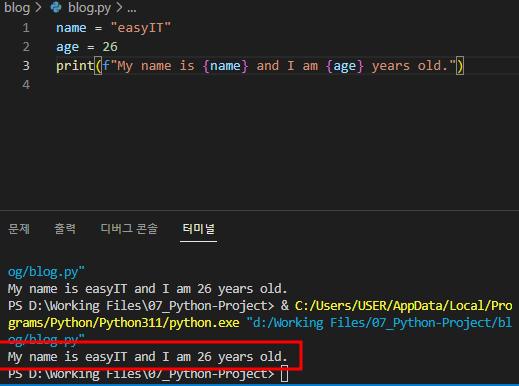 print(result) # 출력: My name is easyIT and I am 26 years old.