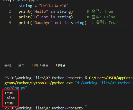 4. 멤버십(in, not in): 이 연산자는 문자 또는 하위 문자열이 문자열에 포함되어 있는지 확인하는 데 사용됩니다.