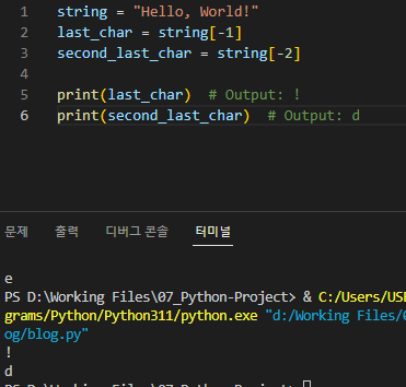 2) 음수 인덱스를 사용하여 문자열의 끝에서 문자에 액세스할 수도 있습니다. 인덱스 -1은 문자열의 마지막 문자에 해당하고 -2는 마지막에서 두 번째 문자에 해당하는 식입니다.