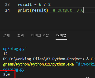 4. 나누기 /: 첫 번째 숫자를 두 번째 숫자로 나누면 부동 소수점 값이 됩니다.
