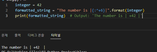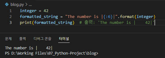 print(formatted_string) # 출력: 'The number is | 42 |'