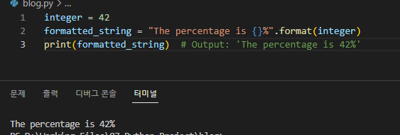 print(formatted_string) # Output: 'The percentage is 42%'
