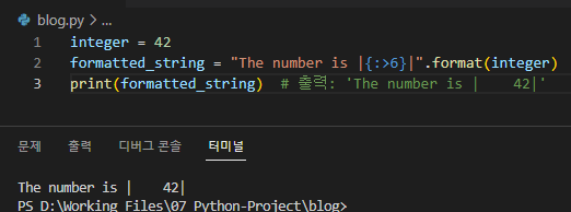 print(formatted_string) # 출력: 'The number is | 42|'