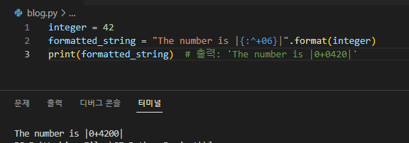 print(formatted_string) # 출력: 'The number is |0+0420|'