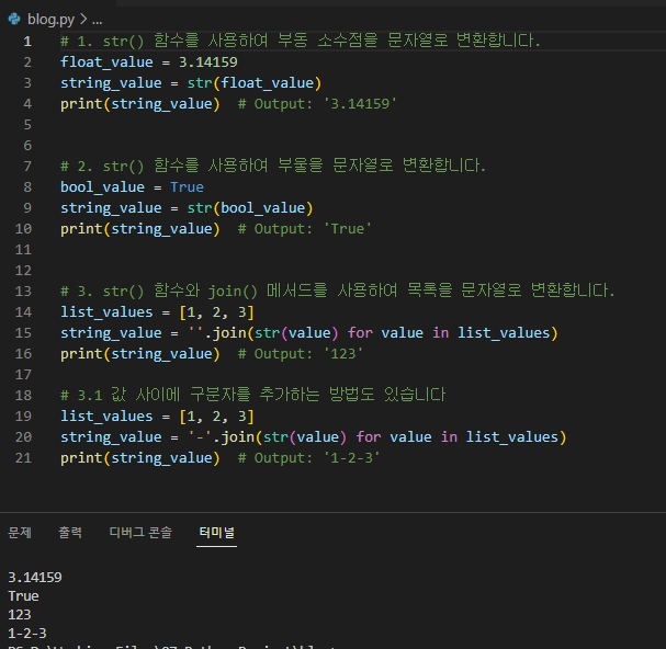 Python의 str() 함수는 객체를 문자열 표현으로 변환하는 데 사용됩니다. 다음은 명령어 사용의 예시를 정리했습니다.