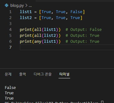 10. all() 및 any() 함수: 파이썬은 all() 및 any()와 같은 내장 함수를 제공하여 부울 값의 이터러블과 함께 작동합니다. all() 함수는 iterable의 모든 요소가 참이면 True를 반환하고 any()는 적어도 하나의 요소가 참이면 True를 반환합니다.