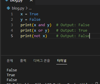 print(x and y) # Output: False