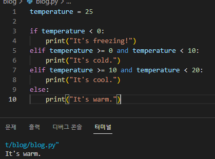 이 예시에서는 온도에 따라 다양한 메시지를 출력합니다. 온도가 0도 미만이면 "It's freezing!"이 출력되고, 0도 이상 10도 미만이면 "It's cold."이 출력됩니다. 10도 이상 20도 미만일 경우 "It's cool."이 출력되며, 20도 이상일 경우 "It's warm."이 출력됩니다.
