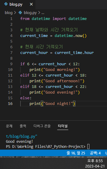 Python의 `datetime` 모듈을 사용하여 날짜와 시간을 처리하고, `if`문을 사용하여 특정 조건에 따라 다른 메시지를 출력하는 예제를 제공하겠습니다.