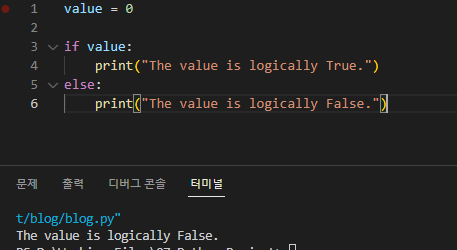 이 경우 출력은 "The value is logically False."입니다. 비슷한 방식으로, 빈 컨테이너나 None 값도 if 문에서 논리적으로 False로 취급됩니다. 이를 이용해 특정 값을 확인하거나, 컨테이너가 비어 있는지 여부를 확인하는 등의 작업을 수행할 수 있습니다. 또한 개발 중에 아직 구현되지 않은 기능을 실행해 오류를 발생하지 않도록 이렇게 처리하기도 합니다.