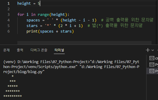 spaces = ' ' * (height - i - 1) # 공백 출력을 위한 문자열