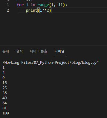 4. 1부터 10까지의 숫자의 제곱을 출력하는 예시: