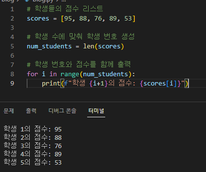 이 코드는 `range()` 함수를 사용하여 학생 번호를 생성하고, `for` 반복문을 사용하여 각 학생의 점수를 리스트에서 가져와 출력합니다.