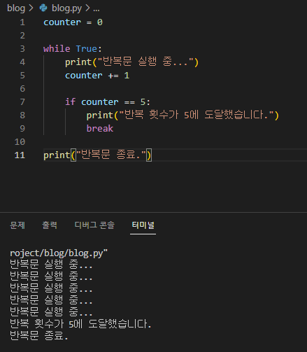 이 예제에서는 while 반복문의 조건이 항상 참인 True로 설정되어 있습니다. 그러나 반복문 내에서 counter 변수가 5에 도달하면 break 키워드가 실행되어 반복문이 즉시 종료됩니다. 이렇게 break를 사용하면 조건이 참인 동안에도 특정 조건을 만족하면 반복문을 종료할 수 있습니다.
