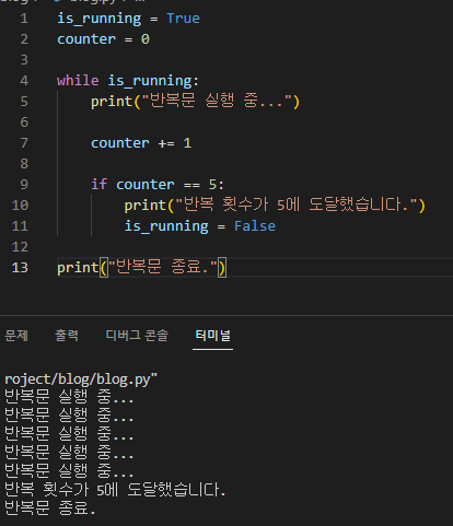 이 예시에서는 is_running이라는 상태 변수를 사용하여 반복문을 제어합니다. is_running이 참인 동안 반복문이 계속 실행됩니다. counter 변수가 5에 도달하면, is_running 값을 거짓으로 변경하고 반복문이 종료됩니다.