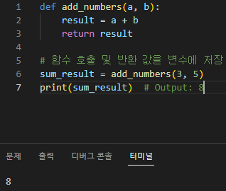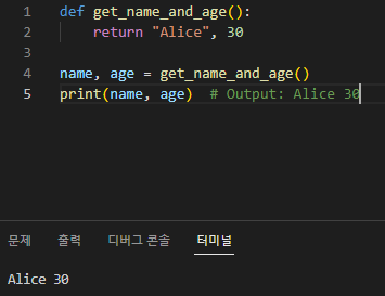 이 예에서 add_numbers 함수는 두 개의 매개변수 a 및 b를 사용하여 합계를 계산하고 return 문을 사용하여 결과를 반환합니다. 함수가 호출되면 리턴 값이 sum_result 변수에 저장되어 출력됩니다. 함수는 여러 값을 튜플로 반환할 수도 있습니다. 예를 들면 다음과 같습니다.