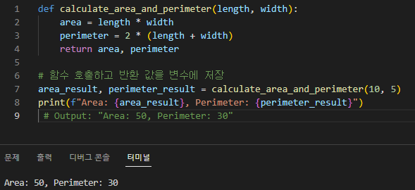 이 예에서 calculate_area_and_perimeter 함수는 직사각형의 면적과 둘레라는 두 가지 값을 반환합니다. 함수가 호출되면 리턴 값은 area_result 및 perimeter_result 변수에 저장됩니다.