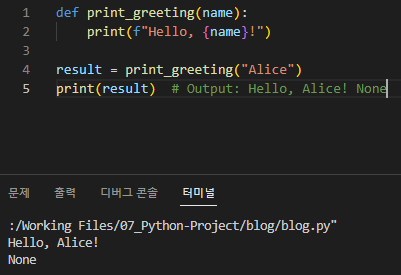 print(result) # Output: Hello, Alice! None