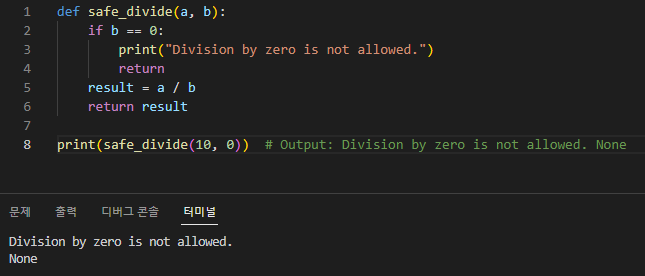 6. Early exit: return 키워드를 사용하면 특정 조건이 충족되거나 오류가 발생하면 나머지 코드를 실행하지 않고 함수를 조기에 종료할 수 있습니다.