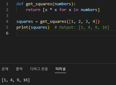 print(squares) # Output: [1, 4, 9, 16]