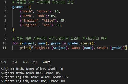 이 예에서는 튜플을 키로 사용하여 grades라는 딕셔너리을 만듭니다. 키는 과목과 학생 이름으로 구성되며 값은 해당 과목에 대한 학생의 성적을 나타냅니다. 그런 다음 items() 메서드를 사용하여 사전을 반복하고 각 키-값 쌍을 변수 subject, name 및 grade로 풀어 정보를 인쇄합니다.