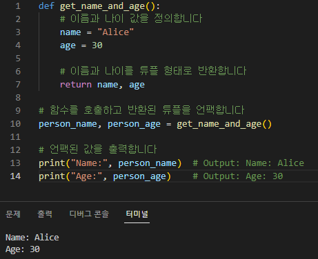 이 예에서 get_name_and_age 함수는 이름과 나이를 포함하는 튜플을 반환합니다. 함수를 호출할 때 반환된 튜플은 person_name 및 person_age 변수로 풀립니다.