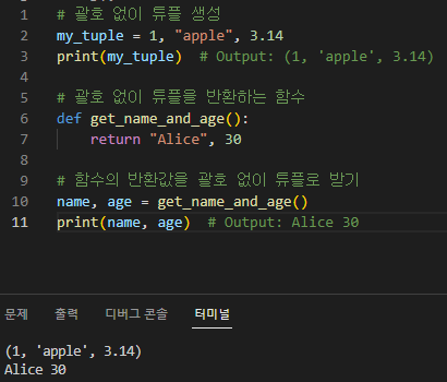- 괄호 없이 튜플 사용하기