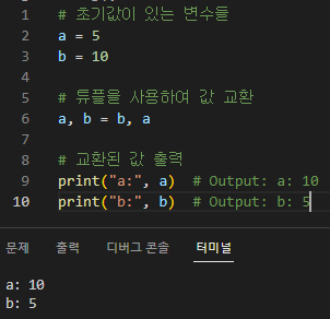 이 예에서는 튜플 (b, a)가 생성된 다음 해당 값이 변수 a 및 b로 압축 해제됩니다. 결과적으로 임시 변수 없이도 두 변수의 값이 교환됩니다.