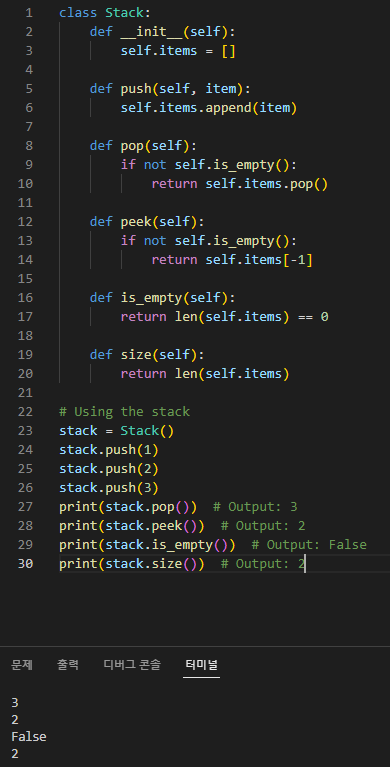 이 예에서는 목록을 사용하여 요소를 저장하는 Stack 클래스를 만들었습니다. 이 클래스에는 푸시, 팝, 엿보기, 스택이 비어 있는지 확인, 스택 크기 찾기 등의 메서드가 있습니다. 그런 다음 스택을 사용하여 LIFO 원칙에 따라 다양한 작업을 수행할 수 있습니다.