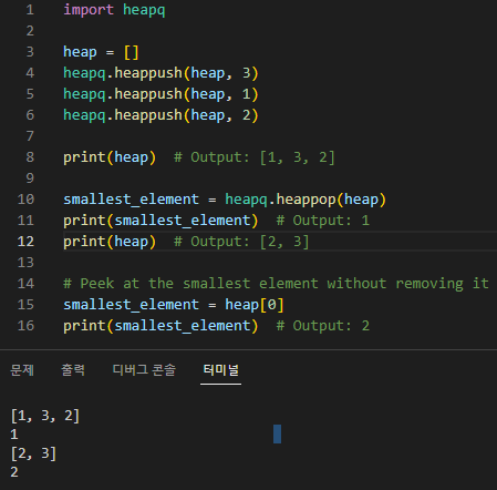 이 예제에서는 heapq 모듈을 사용하여 최소 힙을 만듭니다. heappush 함수를 사용하여 요소를 힙에 삽입하고 heappop 함수를 사용하여 가장 작은 요소를 제거합니다. 제거하지 않고 가장 작은 요소를 살펴보려면 목록의 첫 번째 요소(인덱스 0)에 액세스하면 됩니다. heapq 모듈은 최대 힙 구현을 제공하지 않지만 값을 삽입하기 전과 추출한 후에 값을 부정하여 최대 힙을 생성할 수 있습니다.