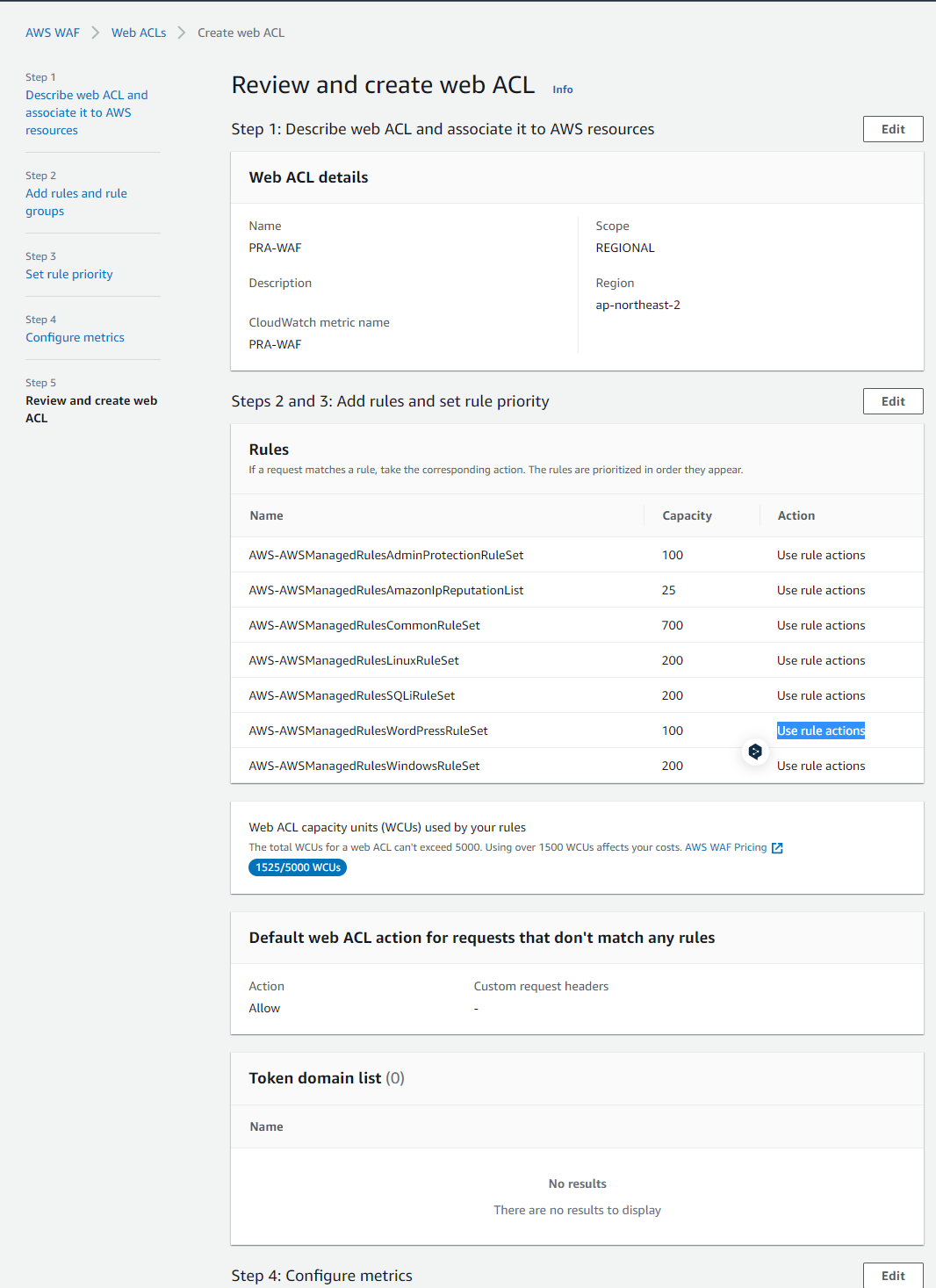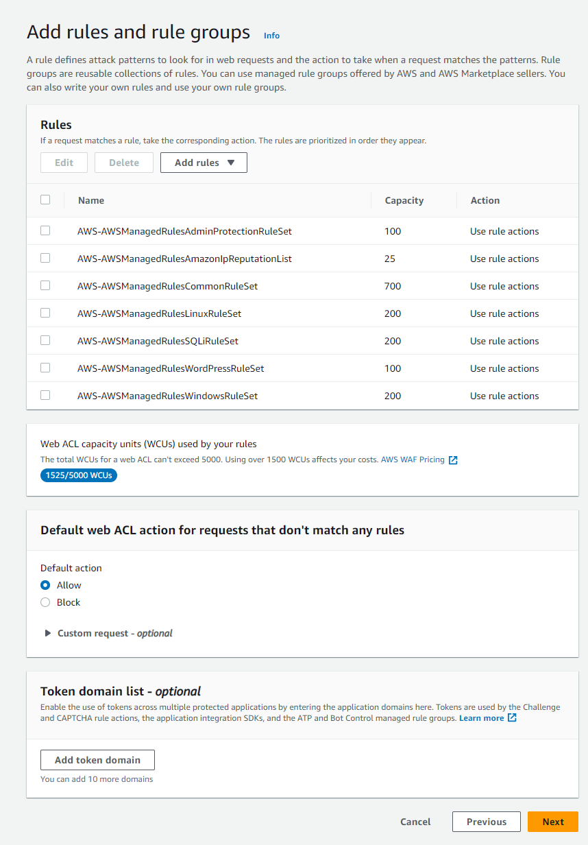 6. 원하는 항목을 선택 후 Add rules 버튼을 클릭하면 아래와 같이 항목이 보이는데 무료 항목은 총 1,500 Capacity까지 선택이 가능합니다.
