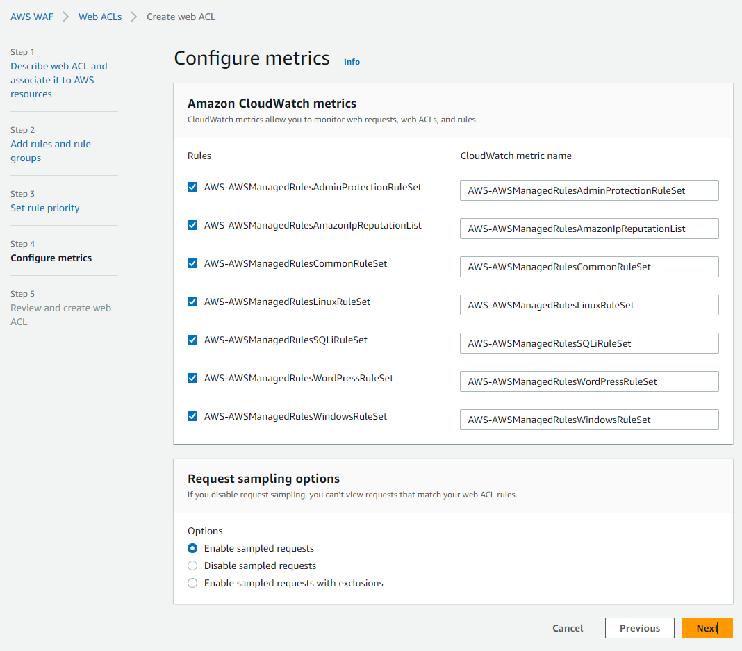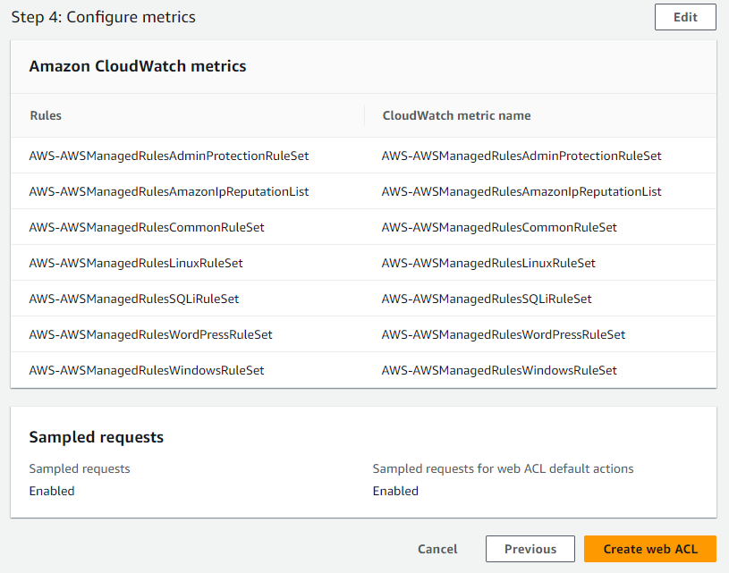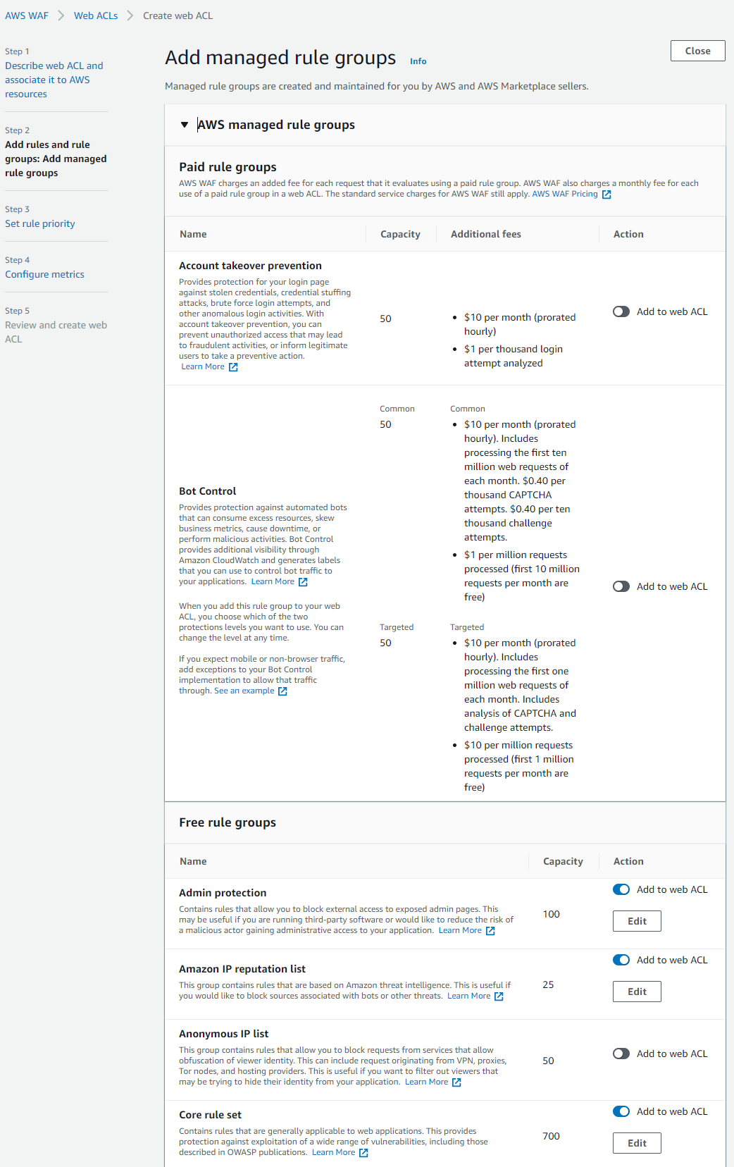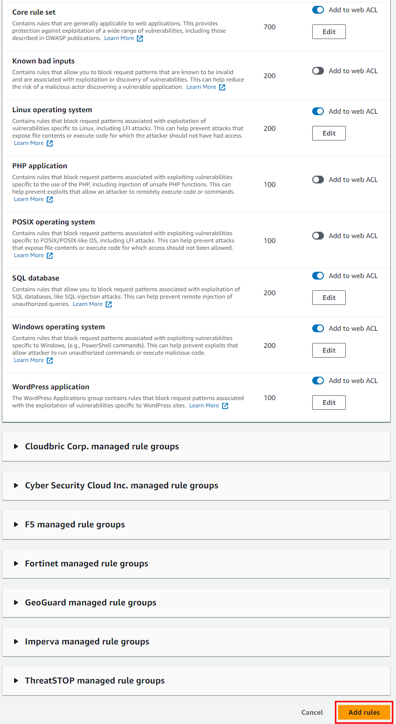 5. 이제 아래에서 어떤 기능을 사용할지 선택해줍니다. 이 포스팅에서는 AWS managed rule groups 부분만 지정해 주었습니다. 각자 원하는 기능을 선택해주면 됩니다.