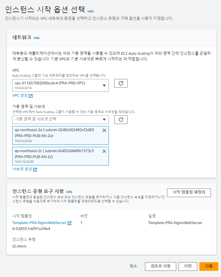 3. 네트워크 환경을 지정해줍니다. Auto Scaling을 사용할 인스턴스가 있는 VPC와 인스턴스의 Subnet을 선택합니다.