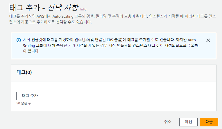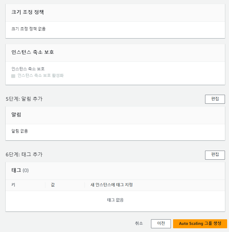 - 그룹 크기 : Auto Scaling으로 생성할 수 있는 최대/최소 개수를 정하고 원하는 개수를 정해줍니다.