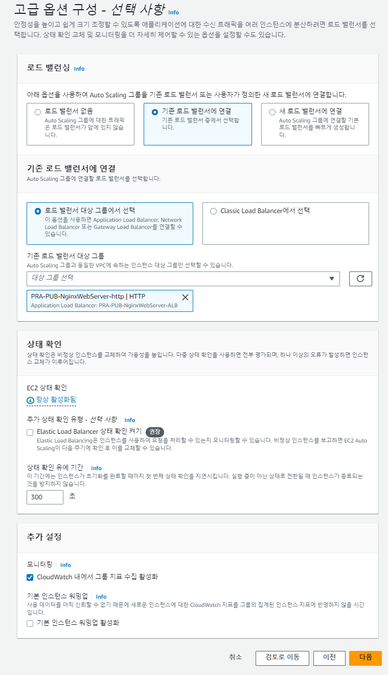 4. 생성해둔 로드 밸런서가 있다면 아래와 같이 사용할 로드 밸런서를 선택해주고 없다면 로드 밸런서 없음을 선택해줍니다.