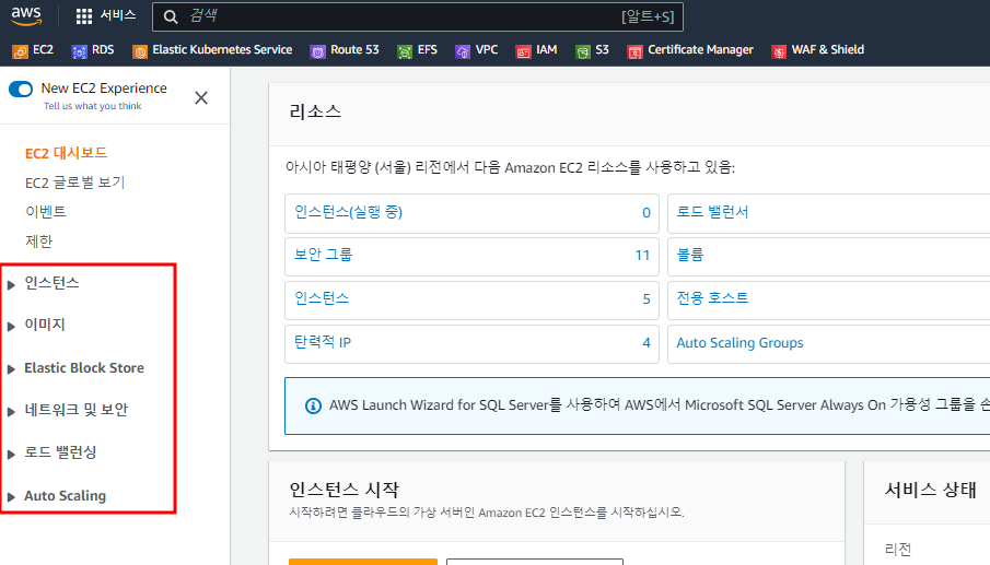 AWS Cloud 웹에서 EC2에 접속하면 다음과 같이 구성되어 있는 것을 볼 수 있습니다. 오늘은 이 구성 요소들이 각각 어떠한 일을 하는지 알아보도록 하겠습니다.