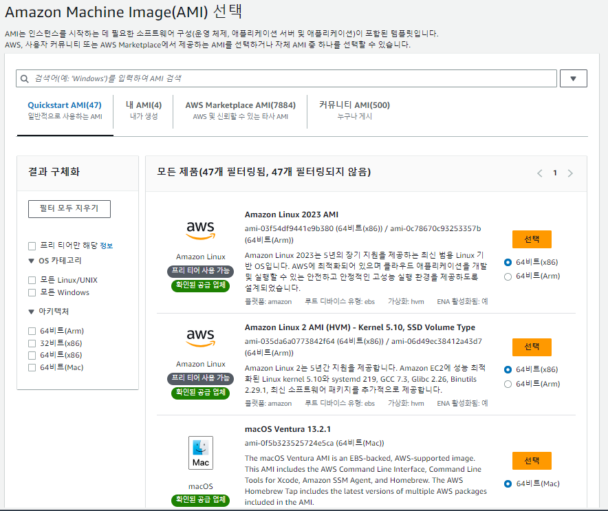 - 커뮤니티 AMI: AWS 사용자라면 누구든지 AMI를 등록할 수 있습니다. 하지만 안정성이나 신뢰성이 떨어질 수 있습니다.