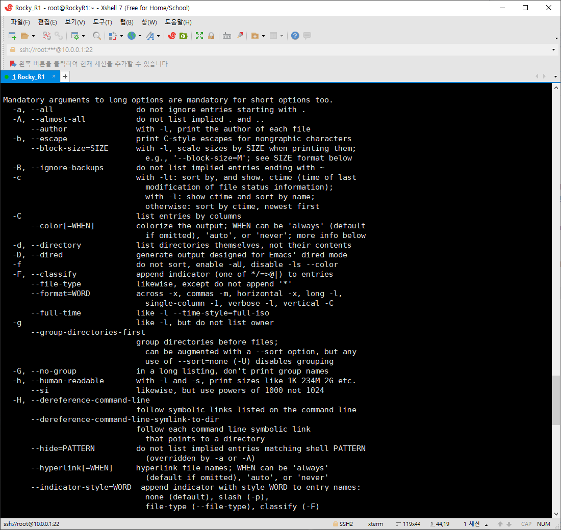 또한 [명령어 --help]를 입력하면 그에 대한 다양한 옵션들을 볼 수 있다. 다음은 ls --help를 입력해 해당 명령어와 옵션에 대한 사용법에 대해 나열되어 있다.