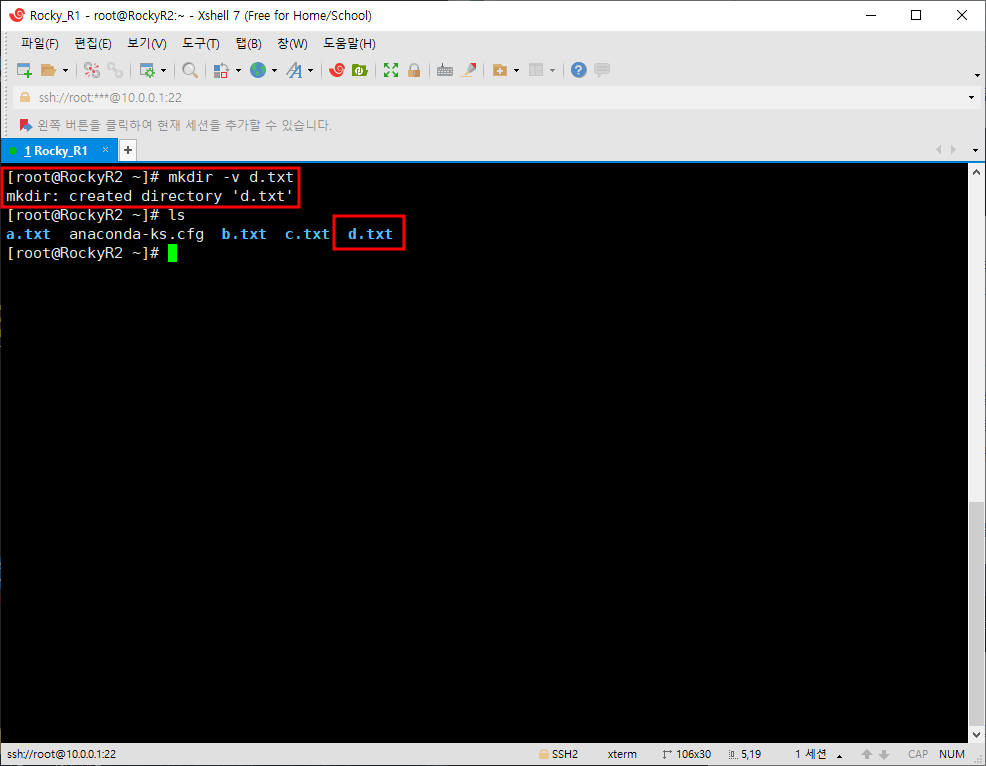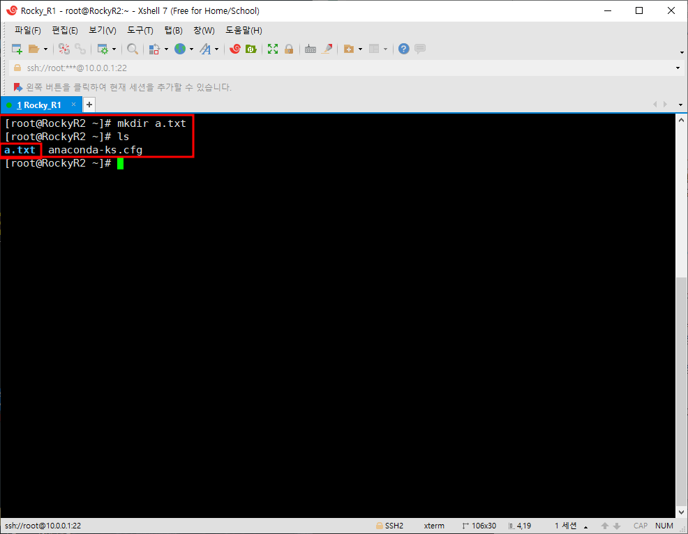 디렉토리를 만드는 명령어이지만, 뒤에 확장자명을 붙여준다면 그 확장자의 파일이 생성된다. 예를들어 a라는 텍스트 파일을 만들고 싶다면 다음과 같이 입력하면 되고, ls명령어를 이용해서 확인해보면 a.txt 파일이 생성된 것을 볼 수 있다.