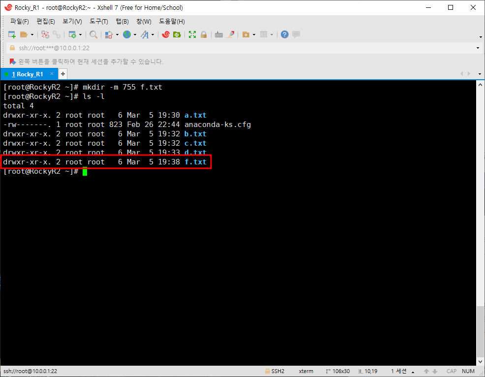 디렉토리나 파일에 대한 권한을 부여할 수도 있는데 해당 명령어는 다음과 같다. 다음과 같이 새롭게 생성된 f.txt가 755의 권한을 가지고 있는 것을 확인할 수 있다.
