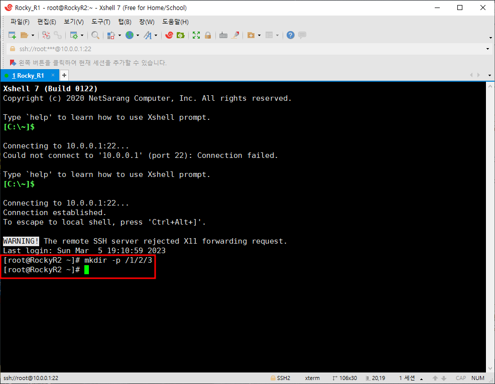 하지만 그렇다고 해서 만들 방법이 없는 것은 아니다. 다음과 같이 -p 명령어를 입력하면 없는 디렉토리는 자동으로 생성하고 그 위치에 명령한 디렉토리를 만들어 낸다.