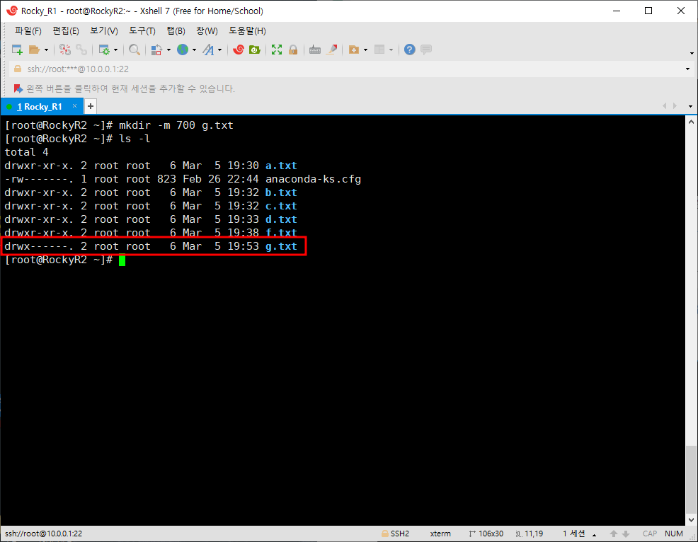 700의 권한을 주면 다음과 같이 그룹과 다른 사용자들의 권한이 없어진 것을 볼 수 있다.