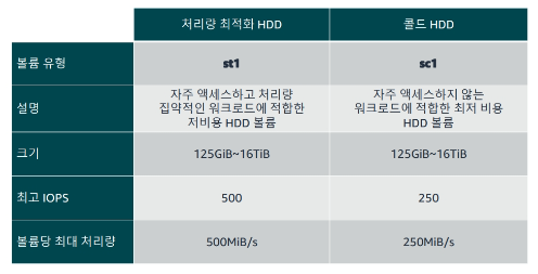 처리량 최적화 HDD 볼륨(st1)에서는 IOPS가 아닌 처리량을 기준으로 성능을 정의하는 저비용 마그네틱 스토리지를 제공합니다. 이 볼륨 유형은 EMR, 추출, 전환, 적재(ETL), 데이터 웨어하우스, 로그 처리 등의 대규모 순차 워크로드에 적합합니다.