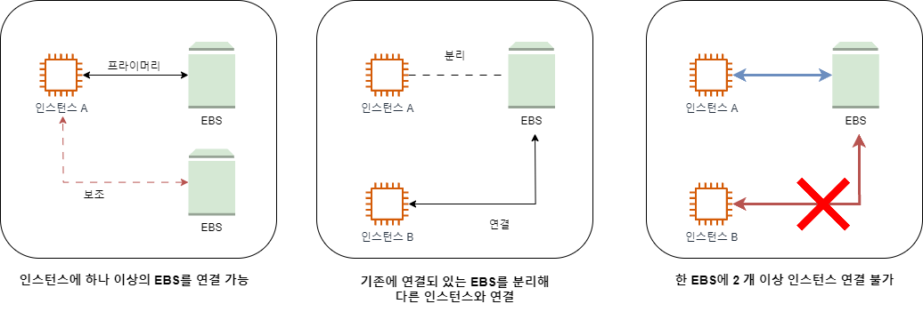 EBS 볼륨은 EC2 인스턴스를 위해 안정적이고 분리 가능한 블록 수즌 스토리지를 제공합니다. EBS 볼륨은 인스턴스에 탑재되므로 데이터가 저장된 위치와 인스턴스에서 사용되는 위치 간에 매우 짧은 지연 시간은 제공할 수 있습니다. 이런 이유로 EBS 볼륨은 EC2 인스턴스를 사용해 DB를 싱행하는데 사용할 수 있습니다.
