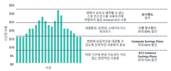 - 나머지 워크로드에는 온디맨드 EC2 인스턴스를 사용하고 컴퓨팅 용량의 정가를 지불합니다.