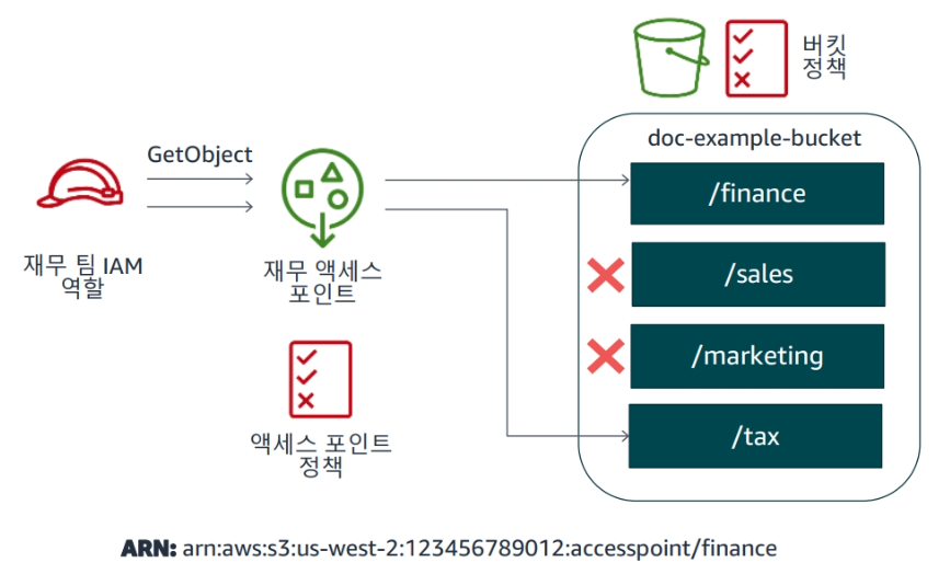 위 그림에서 재무 팀 IAM 역할을 수임한 재무 담당 직원이 재무 액세스 포인트에 GetObject 요청을 전송합니다. 액세스 포인트 정책을 적용하면 재무 담당 역할이 doc-example-bucket에서 접두가 /finance 및 /tax인 객체를 가져올 수 있습니다. 이 재무 담당 역할은 접두사가 sales, marketing인 객체나 S3 버킷의 기타 객체에는 액세스할 수 없습니다. 즉, S3 버킷 정책을 적용하여 각 사용자가 필요한 만큼만 액세스를 허용할 수 있습니다.